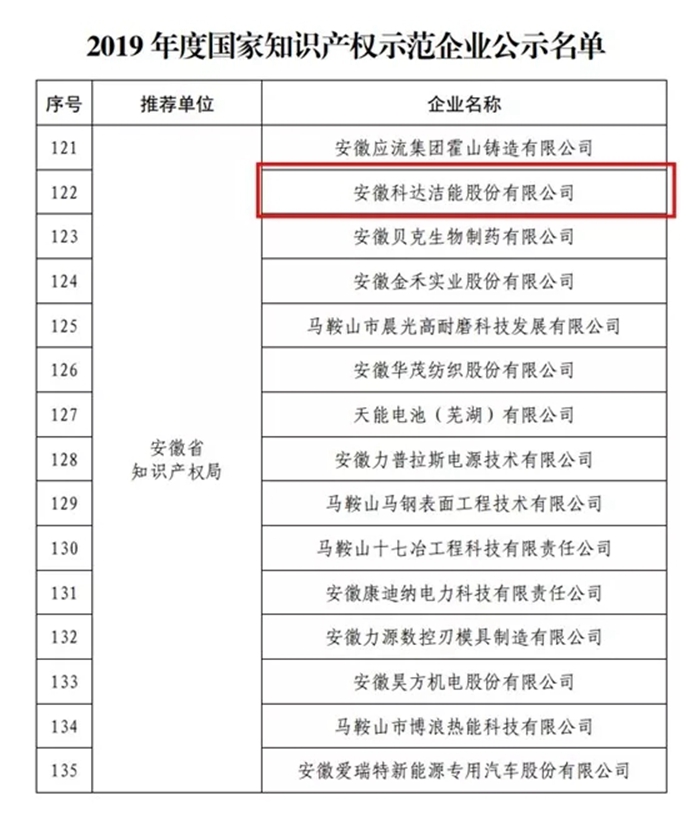 安徽科達(dá)潔能獲評(píng)2019年度國(guó)家知識(shí)產(chǎn)權(quán)示范企業(yè)