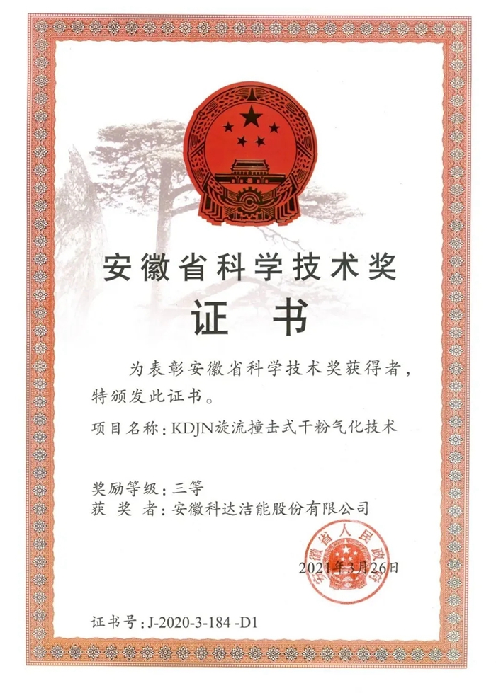 在日前召開的安徽省科學(xué)技術(shù)獎勵暨加快建設(shè)科技創(chuàng)新攻堅(jiān)力量體系推進(jìn)大會上,省委常委、常務(wù)副省長、省政協(xié)副主席鄧向陽宣讀了2020年度安徽省科學(xué)技術(shù)獎勵決定。安徽科達(dá)潔能股份有限公司的“KDJN旋流撞擊式干粉氣化技術(shù)”喜獲省級科技進(jìn)步三等獎。