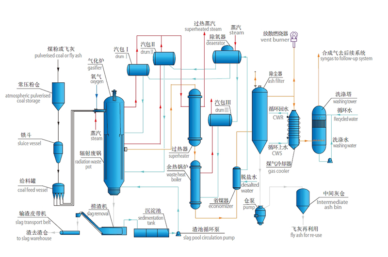 原煤經(jīng)過破碎后進入磨煤系統(tǒng)制成合格煤粉,通過氣力輸送至常壓粉倉,再經(jīng)鎖斗、給料罐加壓送入氣化燒嘴,與氣化劑(純氧或高富氧、蒸汽)在燒嘴內(nèi)充分混合后進入氣化爐反應(yīng)室,在極為短暫的時間內(nèi)完成升溫、揮發(fā)分脫除、裂解、燃燒及轉(zhuǎn)化等一系過程,最終形成以CO和H?為主要成分的粗煤氣離開氣化爐反應(yīng)室,粗煤氣和熔融狀態(tài)的渣在氣化爐中一起下行,渣經(jīng)激冷后進入出渣系統(tǒng)由撈渣機及輸渣皮帶送人渣倉,粗煤氣經(jīng)輻射廢鍋、蒸汽過熱器、余熱鍋爐梯級換熱(產(chǎn)生蒸汽,一部分蒸汽裝置自用,另一部分外供)后,進入除塵器將粗煤氣中的飛灰分離下來,產(chǎn)生的初凈化煤氣通過文丘里洗滌器及洗滌塔進一步除塵降溫,所產(chǎn)生的潔凈煤氣送入客戶指定用氣點。